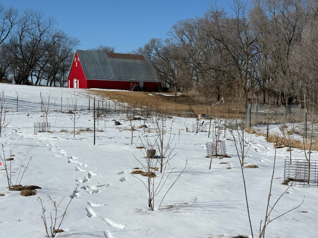 Today the garden lies under a layer of mulch and snow. The mulch is gradually broken down and adding organic matter to the soil. The snow is adding precious moisture to the soil. The fruit trees are still dormant but will be coming to life in just a few weeks.